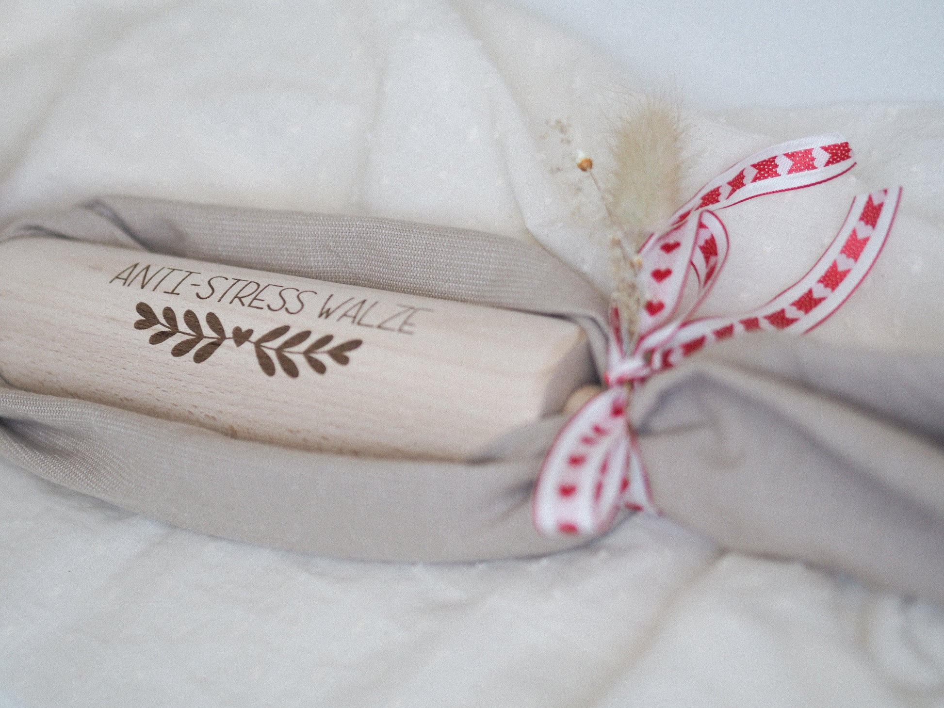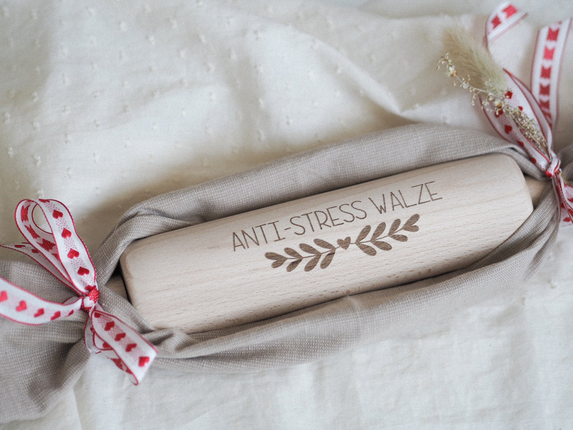 Ein hübsches Nudelholz mit einer gelaserten Aufschrift „Anti-Stress Walze“, schön verpackt in einem Geschirrtuch.